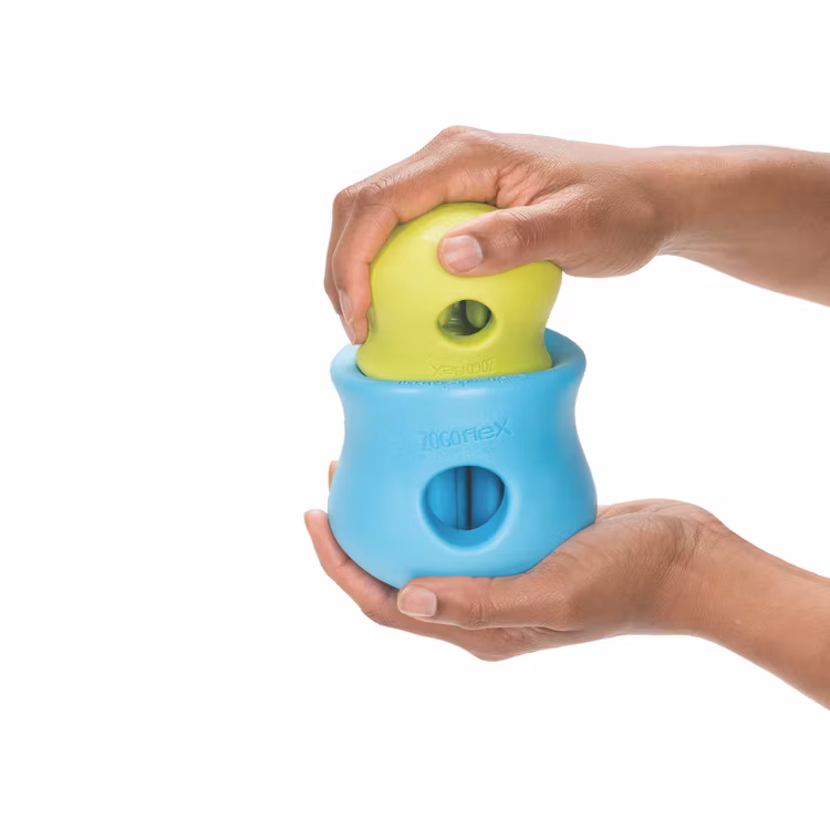Leken har «tenner» som holder på godbitene for en ekstra utfordring til hunden din! Godbitene løsner når «tennene» blir dyttet til.